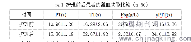 比较护理前后的凝血功能。凝血功能检测指标包括凝血酶原时间( PT) 、凝血酶时间( TT)、纤维蛋白原( Fbg) ,活化部分凝血活酶时间( aPTT) 。