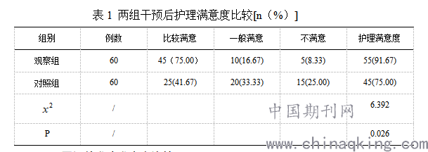 观察组护理后护理满意度高于对照组(P<0.05),见表1。