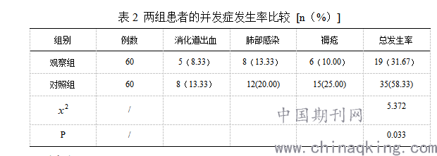 观察组护理后发生化道出血、肺部感染、褥疮的总发生率低于对照组(P<0.05),见表2。