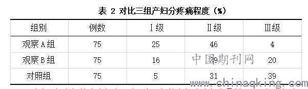 对比三组产妇的疼痛程度,以观察A组的产妇疼痛程度最低,对照组产妇疼痛程度最高,(P<0.05),具有统计学意义。