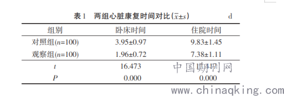 对照组行常规护理模式,包括健康教育、遵医嘱完成各种诊治措施。在对照组基础上,观察组行临床路径护理措施,根据患者病情及严重程度,采取有效全面检查及评估内容,再结合相关内容为患者进行护理服务,并详细记录,最后由患者本人或家属签名登记。相关内容如下:(1)入院当天,带领患者及家属参观医院整体环境,并告知患者早睡早起,使其养成良好生活习惯,并对正确事物有认知;并为患者进行心电监护,实时记录全天心电图变化情况,在操作同时,进行输氧装置护理,保证患者在吸氧时无阻碍发生。(2)第2d,对患者饮食、用药等情况加以指导,定时帮助患者翻身,更换体位,并适当按摩,防止压疮的发生。(3)第3d,针对患者具体情况,指导患者进行适当的康复锻炼,先在床上活动四肢,再依次进行下床站立及行走。训练中,由护理人员为患者讲解锻炼的意义和注意事项。(4)第4~5d,密切关注患者血压动态定时监测,对部分血压异常患者采取控制血压措施,而血压过低者给予升压处理,相反给予降压处理。(5)出院当天,嘱咐家属监督及督促患者遵医用药,并定期会院检查,若出现异常情况,则需立即返院就诊。