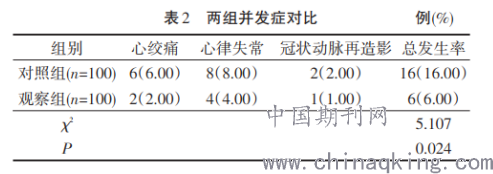 将医院2017年3月—2018年6月收治的100例急性心肌梗死患者,经医学伦理委员会批准,随机分为对照组和观察组,每组各100例。对照组中男52例,女48例;年龄35~70岁,平均年龄(52.26±4.78)岁,心功能分级:Ⅰ级45例,Ⅱ级32例,Ⅲ级23例;观察组中男51例,女49例;年龄34~70岁,平均年龄(52.06±5.23)岁,心功能分级:Ⅰ级48例,Ⅱ级33例,Ⅲ级19例。纳入标准:(1)均符合《急性心肌梗死诊断和治疗指南》[3]诊断标准;(2)了解研究内容,签署同意书;(3)无恶性肿瘤疾病。排除标准:(1)合并精神系统疾病;(2)合并重要脏器器质性损伤;(3)合并意识功能障碍、血液系统疾病。两组基线资料对比,差异无统计学意义(P>0.05),有可比性。