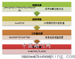 NESMA评估方法包括规模估算、规模调整、工作量估算和费用估算四部分内容,是基于行业基准数据建立参数模型,并通过输入各项参数,确定待估算项目工作量、成本估算值的方法。采用方程法确定项目工作量、成本的典型过程如图2-1所示: