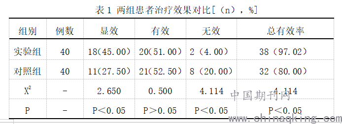 两组患者均治疗时间相同,同为28天,但实验组治疗效果更为确切,结果表示其总治疗有效率为97.43%,显著高于对照组,对照组总治疗有效率为76.92%,P<0.05,具有统计学价值,详细数据情况见表1。