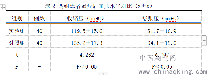 对两组患者治疗后血压进行对比,实验组治疗后其收缩压、舒张压指标明显低于对照组,P<0.05,具有统计学价值,详细数据情况见表2。