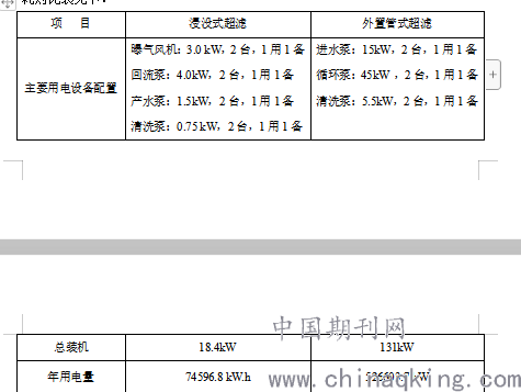 外置管式超滤由于操作管理、膜的清洗更换和增设容易等优点,目前是国内垃圾渗滤液处理领域占有主流地位,但其由于错流速度高而必须选择的大流量循环泵,造成能耗高的缺陷一致备受诟病。浸没式超滤相比外置管式超滤,节能效果明显。以150m3/d的处理规模比较浸没式超滤和外置管式超滤的设备配置及功耗对比表见下: