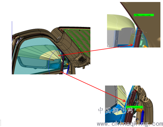将轮廓提取与眼点形成连接曲面后,测量连接曲面到A柱间隙和连接曲面到固定三角块的间隙。