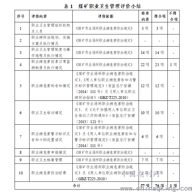 煤矿职业卫生管理情况评价汇总情况见表1。