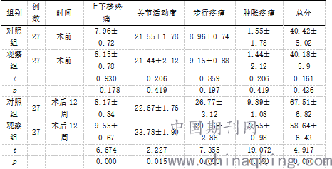 手术前,两组患者的评分差异无统计学意义(P>0.05),手术后12个月两组患者的上下楼疼痛评分、关节活动度评分、步行疼痛评分、肿胀疼痛评分和总分都比手术前高,差异具有统计学意义(P<0.05)。见表1。