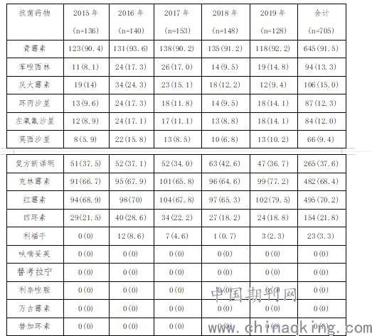表1 2015 年-2019 年705 株SAU耐药率的变化情况[n,(%)]