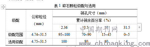 在试验开展前,选择棱角状碎石,初次检验发现针片状颗粒居多。清洗和风干原材料。为了全面分析不同粒径针片状颗粒与水泥混凝土性能的影响关系,将针片状颗粒设置在筛孔上。由于颗粒粒径的差异不大,试验结果不明显,所以需要优化试验方案:在试验操作时,选择4.75mm、16mm与26.5mm的3个粒径,筛分试样之后,将其存储于容器备用,同时挑选出容器内的针片状颗粒。试验操作方法完全按照国家行业标准,挑选出4.75mm、16mm与26.5mm粒径的针片状颗粒待用。按照现行标准选择碎石颗粒级配范围,按照现场材料,固定试验用碎石级配。如表1所示: