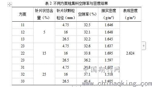 通过表2数据可知,当针片状含量在15%时,颗粒会集中在26.5mm筛孔上,表明粗集料振实堆积密度小,空隙率比较高。当针片状含量在25%时,颗粒会集中在16mm筛孔上,表明粗集料振实堆积密度小,空隙率比较高。