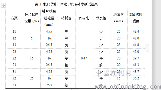 分析表3结果可知,当针片状含量在5%时,针片状颗粒在不同筛孔上的试验结果差异小,性能良。当针片状含量在15%时,针片状颗粒集中在4.75mm筛孔上,性能良。然而在16mm和26.5mm筛孔上,混凝土流动性和保水性均比较差。当针片状含量在25%时,针片状颗粒集中在4.75mm筛孔上,性能良。然而在16mm和26.5mm筛孔上,混凝土流动性和保水性均比较差,性能影响显著。通过分析强度试验结果控制,针片状颗粒总量增加时,强度系数会持续下降。由于受到时间限制,没有检测水泥混凝土的耐久性。按照试验结果分析,当水泥混凝土的保水性差时,则需水量比较大,对混凝土耐久性的影响较大。