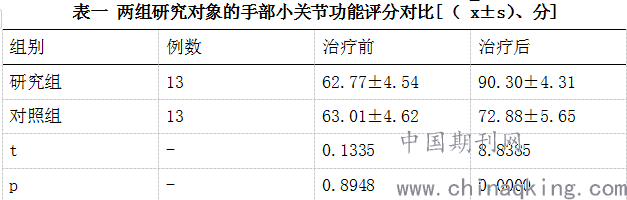 治疗前两组研究对象的手部小关节功能评分对比无显著差异(p>0.05),治疗后研究组患者的手部小关节功能评分优于对照组,差异明显,p<0.05,详见表一: