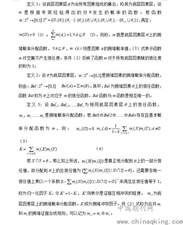当专家预测主干航路拥堵时,把影响拥堵作为证据,那么关于拥堵程度的命题就是专家对于证据预测的信度。基于该证据进行预测,把专家命题作为概率分配标准,假设证据间相互独立,便可以建立拥堵预测模型,结合证据合成规则,获得不同程度主干航路的拥堵等级和基于动态因素影响下的拥堵等级的可靠性。