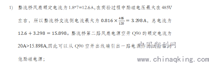 1)整流桥风扇额定电流为1.8*7=12.6A,在实验过程中励磁电压最大在485V左右,所以整流桥交流侧电流最大为,总电流为。整流桥第二路风扇电源空开Q90的额定电流为20A>15.898A,因此可以从Q90空开出线端引出一路电源作为试验临时他励磁电源;