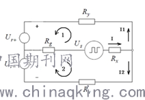 其中Rx为测量回路电阻,Ry为注人大功率电阻(通常其阻值为47kO),Us为注入电源模块,Rg为转子绕组对大轴的绝缘电阻,Ur为转子电压,i为转子绕组接地故障泄露电流,α为转子绕组接地位置。保护的等效电路如图4所示。