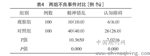 在精神错乱、认知障碍上,对照组发生率分别为40.0%、26.0%,观察组分别为10.0%、6.0%,二者对比存在统计学差异(P<0.05),具体如表4所示。