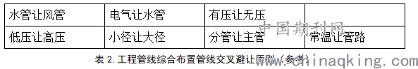 为保证管线布置的合理性,工作人员在布置管线时应当以满足综合平衡技术的要求为目标,尽可能的避免管线出现交叉,若管线需要交叉转弯,那么应当秉持如表2所示的原则,处于对工程建设成本的考虑,对于一些市场造价较高的管线,也应被列为优先布置之列。另外,工作人员要将管线布置的框架作为整体综合平衡的基础,依据实际的情况与施工要求作出细节处的调整,并将质量与经济的要求作为管线布置的最终目标。