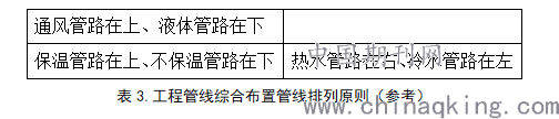 工程管线的综合布置要以管道排列间距的安排为核心,将有利于管道、电缆桥架及其他部分的安装与检修为前提条件,并遵循表3中的原则,对建筑机电设备安装工程管线进行综合且有序的排列。