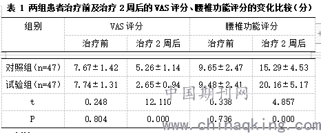 表 1 两组患者治疗前及治疗2周后的VAS评分、腰椎功能评分的变化比较(分)