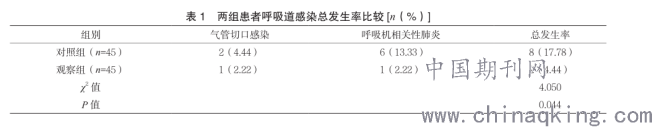2.1两组呼吸道感染发生率比较?观察组呼吸道感染总发生率为4.44%,低于对照组的17.78%,差异具有统计学意义(P<0.05)。见表1。