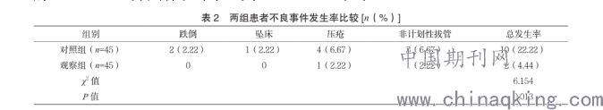 2.2两组不良事件发生率比较?观察组不良事件总发生率为4.44%,低于对照组的22.22%,差异具有统计学意义(P<0.05)。见表2。