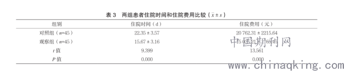 2.3两组住院时间和住院费用比较?观察组住院时间短于对照组,住院费用低于对照组,差异均有统计学意义(P<0.05)。见表3。