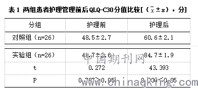 表1 两组患者护理管理前后QLQ-C30分值比较[(±s),分]
