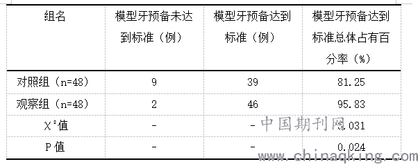 数据详细计算结果中,观察组模型牙预备达到标准总体占有百分率比对于对照组涉及样本统计资料提高(P<0.05)。