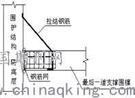 因为基坑的围护墙体,与基础底板之间相对脱离,最后一道混凝土支撑需嵌入底板,成为底板的一部分并与底板共同作用,故基坑的围护结构与混凝土支撑两者之间应设置隔离层,隔离层处用钢筋网,并用细石混凝土填充,使其在竖向能相对自由沉降。如图4所示:
