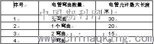 3.2.2配管时,为了节省材料,便于施工,线路走向沿最短线路,并尽可能不弯曲,线管超过下列长度时加过路盒。明配时弯曲半径不小于外径的6倍,当只有一个弯管时,弯曲半径不小于外径的4倍。暗敷混凝土的弯曲半径不小于管道外径的10倍,一般情况其弯曲半径不小于管外径的6倍。电管弯曲允许最大长度见下表1