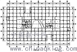 (3)方案三:板柱-剪力墙结构(无梁楼盖)。采用板柱-剪力墙结构形式时,根据《建筑抗震设计规范》GB 50011-2010第6.6条及《高层建筑混凝土结构技术规程》JGJ 3-2010第8.1.9条的有关规定,办公区域楼板厚度取300mm,在柱上板带中设置了构造暗梁,暗梁宽度取柱宽及两侧各1.5倍板厚之和,周边封口梁高度为550mm,中部非办公区域采用普通梁板式楼盖,板厚150mm。采用YJK有限元计算,计算时将楼板定义为弹性板6,各项指标合理可行,均能满足相关规范标准的要求。结构的标准层结构平面布置图如下图。