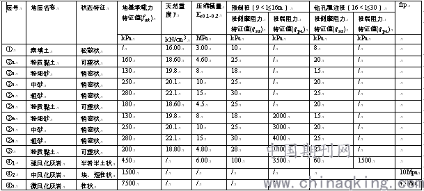 当考虑采用预应力管桩或其它小直径桩的基础方案时,一层地下室(地块四)按承台底埋深为5.50m进行估算,桩端按不入岩考虑,则管桩有效桩长约为6~11m。二层地下室(地块二、三)按承台底埋深为8.50m进行估算,桩端按不入岩考虑,则管桩有效桩长约为5~8m。