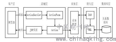 借助于把Hibernate技术与Struts技术进行整合,能够把原有的四层J2EE框架转变成包含数据库层、数据持久层、业务处理层、表现层以及客户层这五个层次。如果利用五个层次进行具体的应用程序开发,则更能够清晰的提现系统的设计和应用过程。图2对Struts和Hibernate组合框架的体系结构进行了设计。