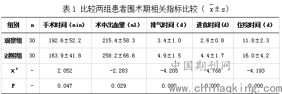 在本次研究中,除手术时间观察组长于对照组,其余四项,观察组均优于对照组,两组患者数据对比差异具有统计学意义 (P>0.05)。