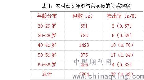 在3864例农村妇女中,20-29岁宫颈癌发生率为0.57%(2例),30-39岁发生率为0.69%(5例),40-49岁发生率为0.70%(10例),50-59岁发生率为1.94%(17例);60-69岁发生率为0.82%(4例)。