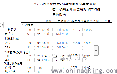 14. 7% 。大学及以上文化程度孕产妇足月顺比例较高 ( ?2 = 5. 312,P < 0. 05。见表 2。