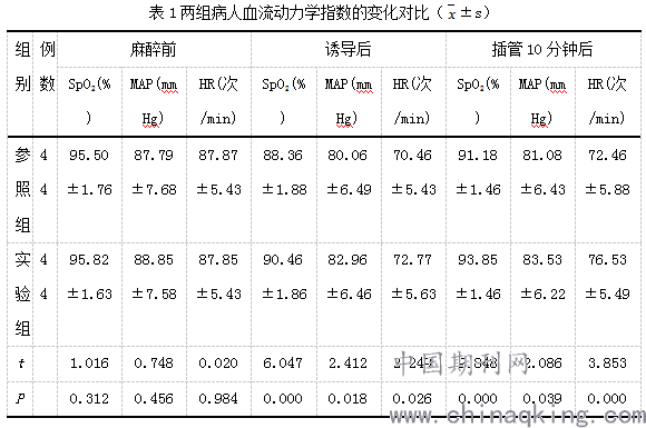 对比两组病人麻醉前、诱导后以及插管10分钟后血流动力学指数的变化,包括血氧饱和度(SpO2)、动脉压(MAP)与心率(HR)。