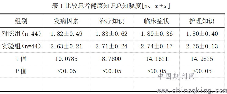①比较患者健康知识总知晓度。涉及发病因素、治疗知识、临床症状和护理知识。②比较患者生存质量。涉及生活能力、躯体功能、社会功能和物质生活[4]。