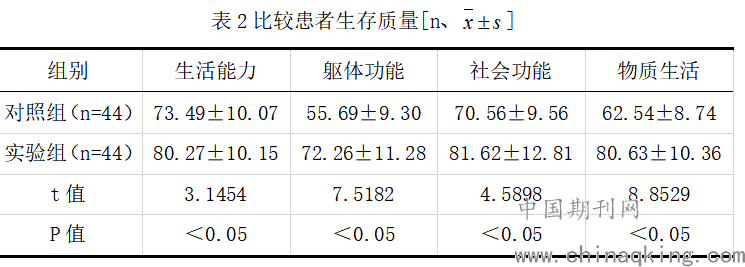 实验组生存质量较优于对照组,数据比较有意义(P<0.05),见表2。