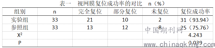 从视网膜复位成功率上看,实验组明显优于参照组,对比差异具有统计学意义(p<0.05),如下表一。