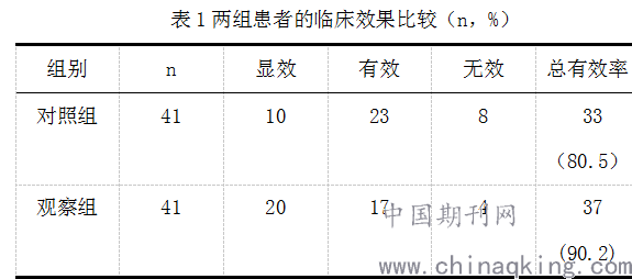 治疗后,观察组的总有效率为90.2%,对照组的总有效率为80.5%,组间比较存在显著差异,(P<0.05)差异具体统计学意义,详见表1。