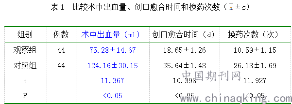 比较术中出血量、创口愈合时间和换药次数情况:相比于对照组,观察组均较低(P<0.05),见表1。