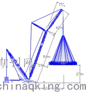 根据现场工况进行障碍物安全距离计算,当模块到达最大起升高度+29m时,吊车的工况为:重型主臂仰角为65°、主副臂夹角15°、工作半径为62m。根据此工况建立计算模型,如图2所示。此时模块距起重臂的最小距离为19m,满足吊装要求。依据现场施工进度,,模块吊装时现场塔吊的顶部标高为+26.4m,模块提升高度为+29m,满足安全距离要求。