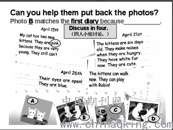 例如:教师在进行小学五年级下册第四单元B的“Read and write”的教学时,在完成前面的教学内容之后,教师可以让学生看“Can you help them put away the photos?”。让学生自主观察和学习之前,教师可以为学生做个示范,比如:“Photo B matches the first diary because they’re pink.”在第一篇四月十五的日记中,用黑笔勾画出“pink”,在下面四幅图中找到第二张图。教师引导学生观察每一篇日记中的关键信息,找出关键词,根据关键词找到与之对应的图片。学生通过观察和思考,找到每一个文本对应的图片,并用英语表达出来。培养学生图文对照的学习方法。