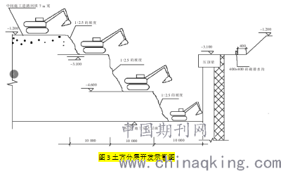 深基坑支护技术的主要目的就是为了保障在土方开挖过程中保证施工的安全,工程结构的稳定。基坑在挖掘过程中由于会对原状土进行破坏,从新用人工物资材料构建新的力的平衡状态,在这个过程中就伴随着安全事故风险。因此,基坑开挖前的方案设定一定要遵循土方开挖分层进行,先撑后挖,开槽支撑,禁止超挖的原则(见图3)。在开挖前的基坑支护技术的选择关系着施工的安全性和可靠性,对足够支撑到项目完成具有关键性的作用。所以,深基坑支护技术要结合施工现场的实际建筑需要,特别是要注重开挖深度的问题,按照国家规范标准,来设置对应的挡土、挡水、支撑系统,从而让现场的环境和条件在合理的计划和有效的管理下按照既定的目标执行。