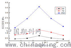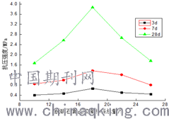 石膏的掺量相同时,掺脱硫石膏的材料其3d强度低于掺天然石膏的3d强度,7d和28d强度要大于掺天然石膏的强度。当天然石膏或脱硫石膏的掺量为18%时,材料的3d、7d和28d强度最大,掺天然石膏分别为0.76MPa、1.34MPa和3.60MPa,掺脱硫石膏的分别为0.67MPa、1.37MPa和3.87MPa,比掺天然石膏的分别提高了-11.84%、2.24%和7.50%。