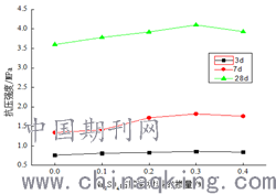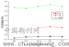 Na2SO4的掺量相同时,掺脱硫石膏的材料其3d强度低于掺天然石膏的3d强度,7d和28d强度要大于掺天然石膏的强度。当Na2SO4的掺量为0.3%时,材料的3d、7d和28d强度最大,掺天然石膏分别为0.86MPa、1.82MPa和4.10MPa,掺脱硫石膏的分别为0.85MPa、1.86MPa和4.19MPa,比掺天然石膏的分别提高了-1.16%、2.20%和2.20%。