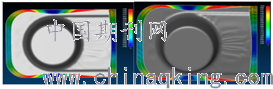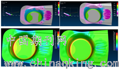 从图3可以看出,从表观上看,两种不同材料在油包周围均由一定的起皱,SPCC材料起皱的更明显。从数据分析,各方向板料流入量比较均匀,DC03材料最大流入量为9.766,SPCC材料最大值为10.187,比DC03的流入量要大,也就是说SPCC材料更容易起皱,因此成型需要更大的压边力。